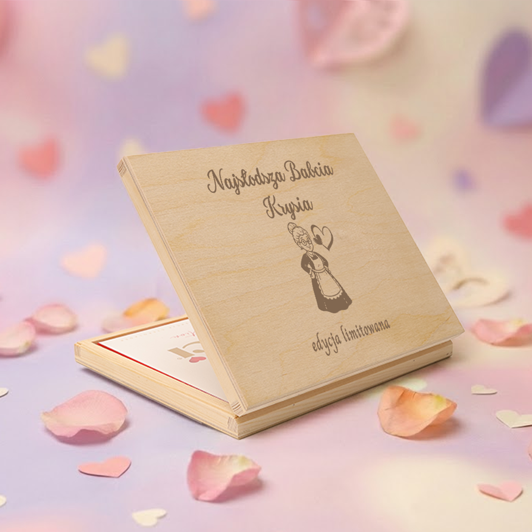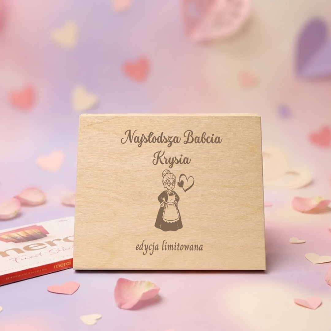 Pudełko drewniane na czekoladki z personalizowanym grawerem to idealny pomysł na prezent z okazji Dnia Babci.