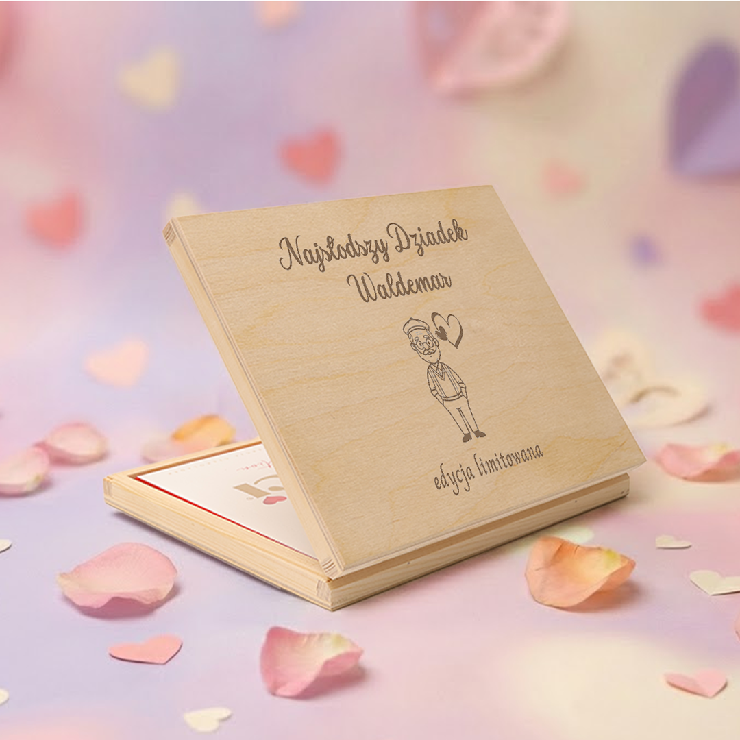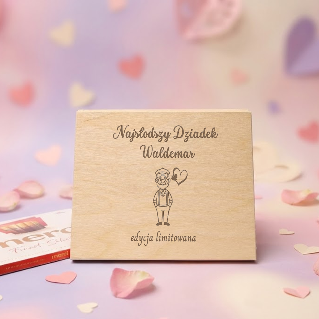 Pudełko drewniane na czekoladki z personalizowanym grawerem to idealny pomysł na prezent z okazji Dnia Dziadka.