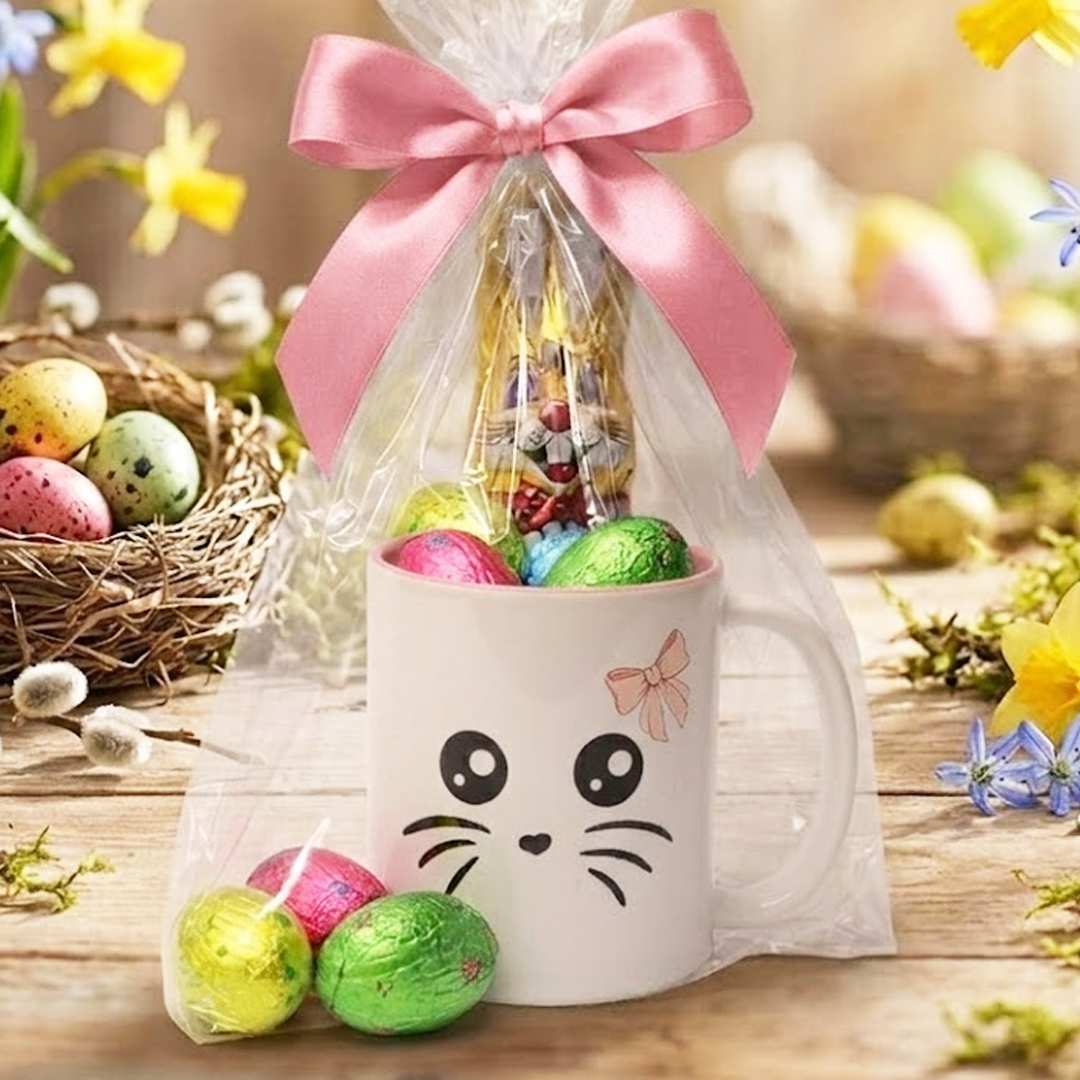 Zestaw składa się z 1 kubka z nadrukiem, 1 króliczka czekoladowego oraz 5 jajeczek mlecznych z nadzieniem - całość zapakowana w celafon i zawiązane wstążeczką.